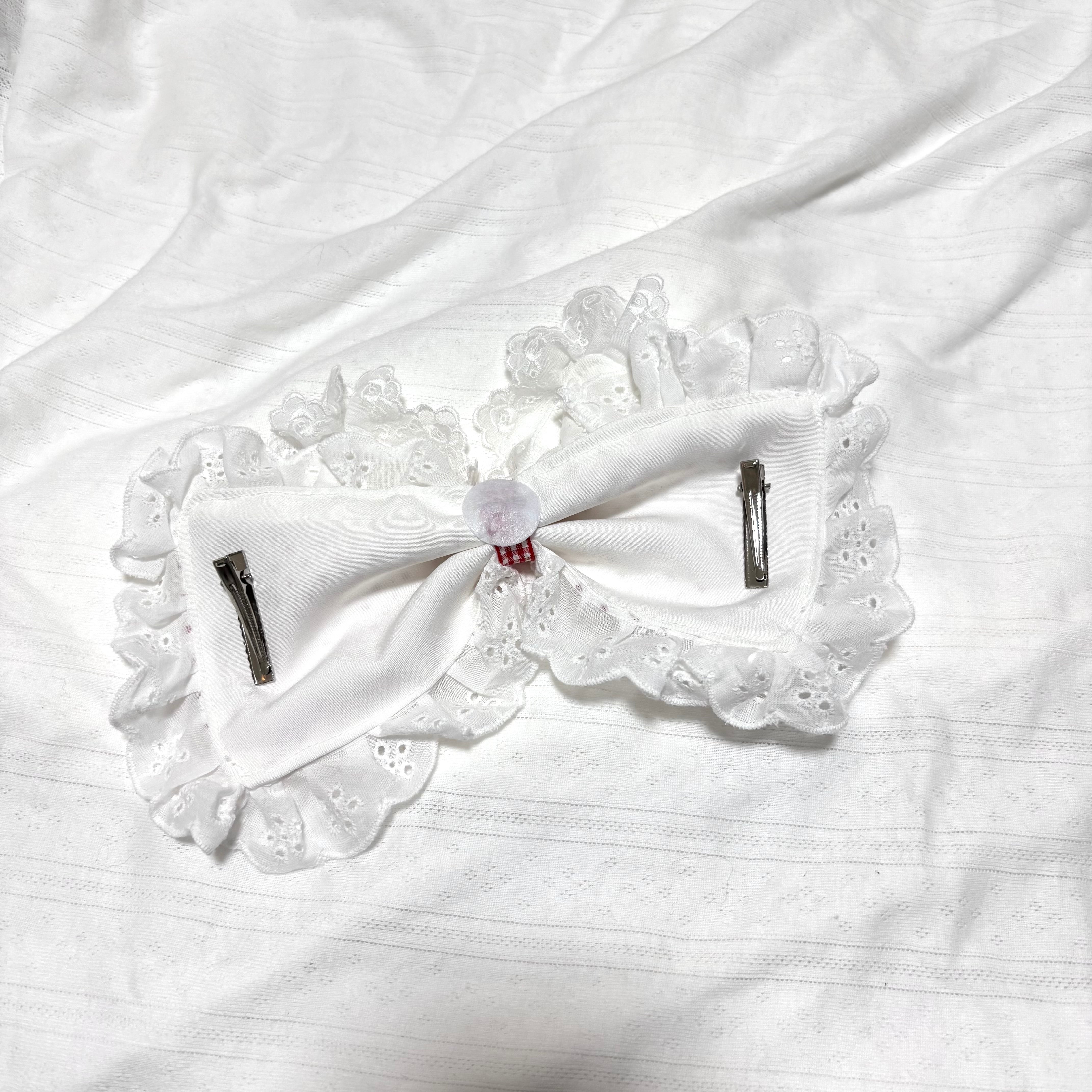 赤色の小さめのドット柄の生地とレースを合わせたおおきなリボンのヘッドドレス