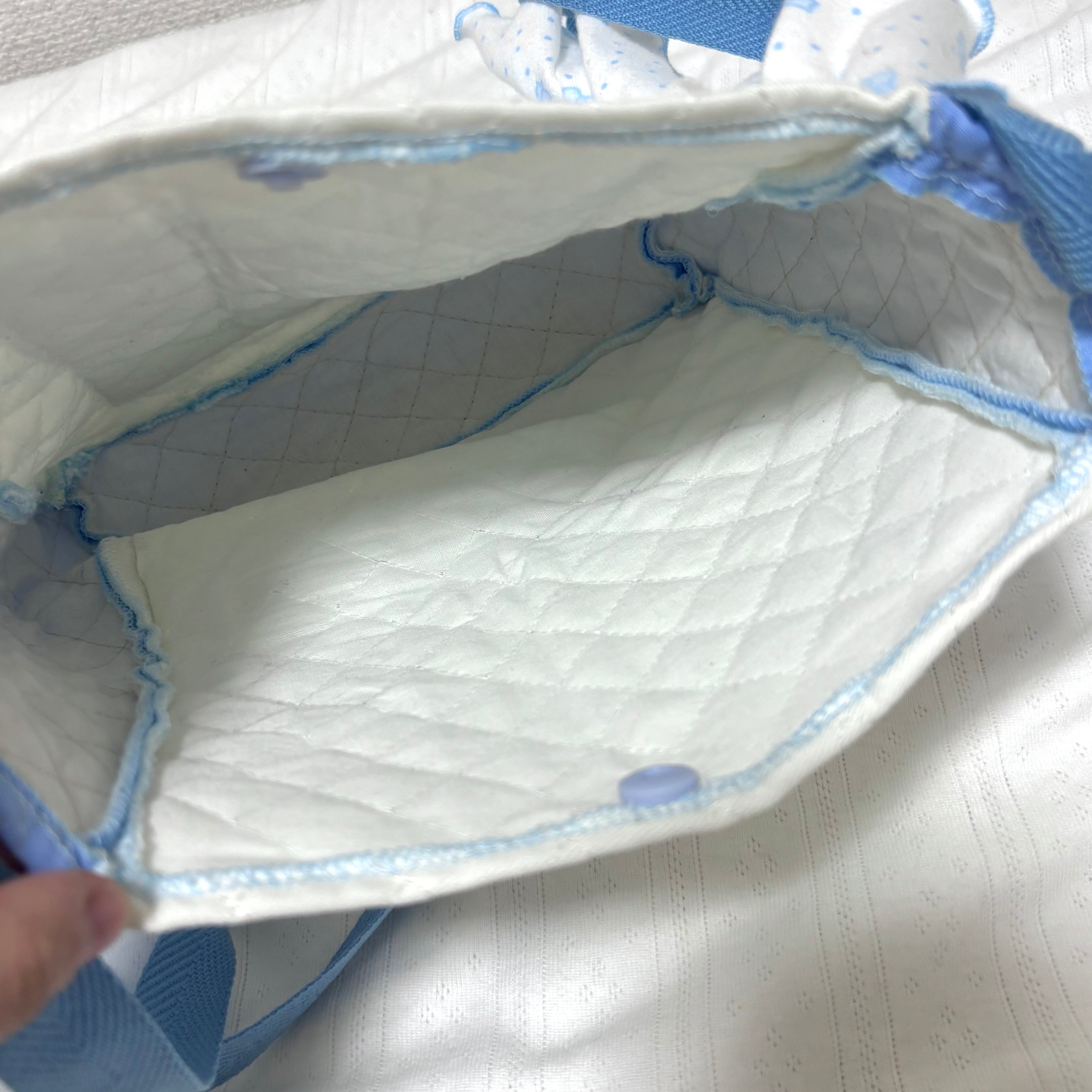ポケット、ショルダー紐、サイドの生地は水色にしているツートンカラーもポイントです。