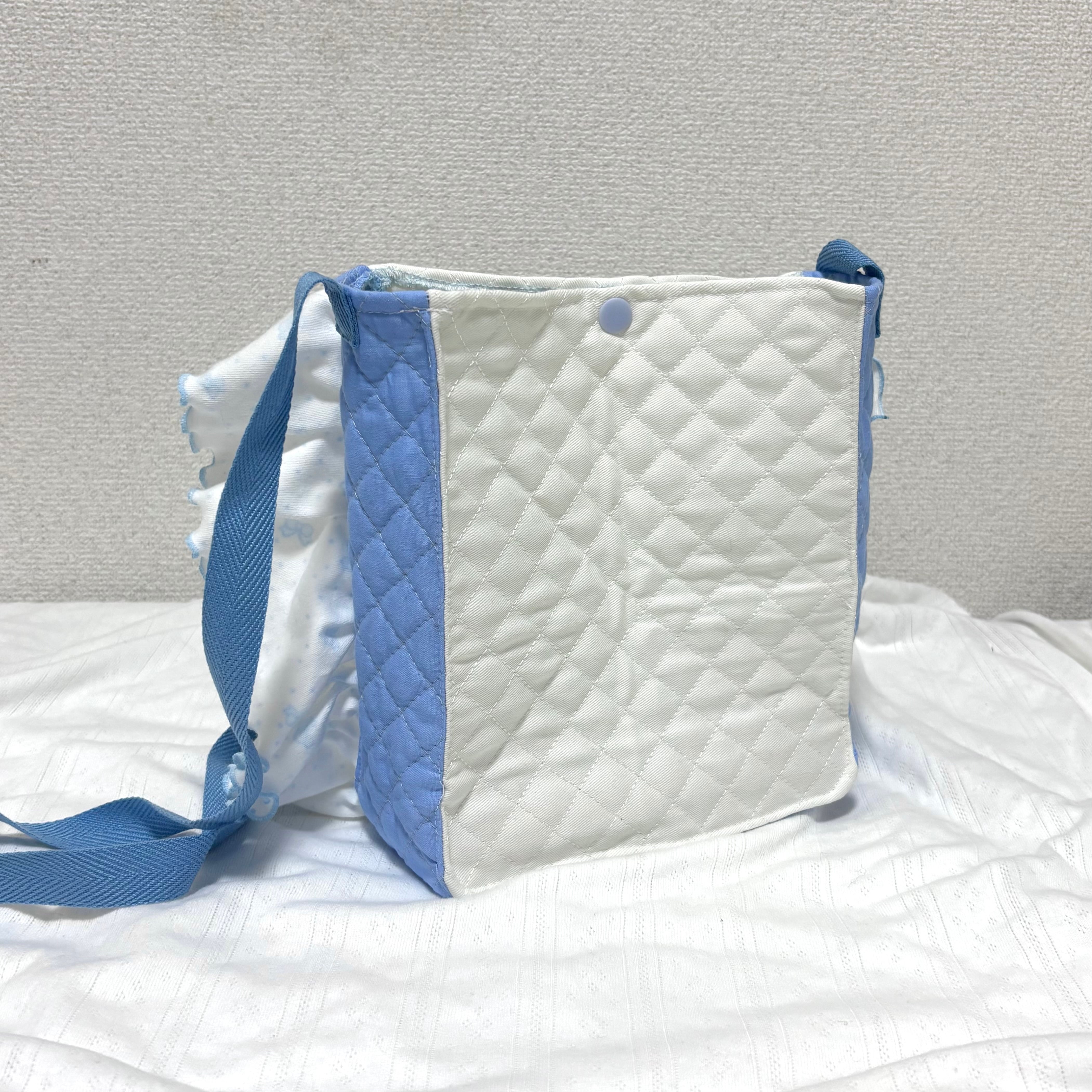 水色の生地を組み合わせたコラージュショルダーバッグ